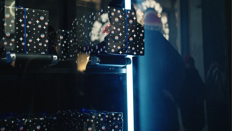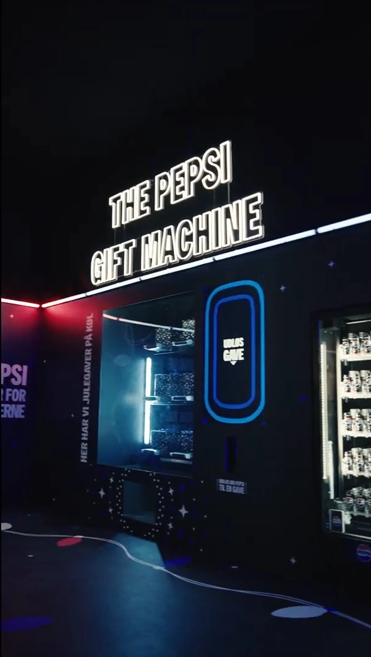 The experience was created for a moveable pop-up store, visiting Copenhagen and Aarhus for Christmas. Here visitors could buy a Pepsi soda, scan it.. and moments later the machine came to life: conveyor belts rolling, lights flashing before delivering a wrapped Christmas gift ready to place under the tree.